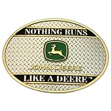 This men's Montana Silversmith John Deere Belt Buckle features silver tire track design, "Nothing Runs Like A Deere" on black ribbons, "John Deere" in gold letters underneath the JD logo. Fits on most belts. Measures: 2 ½" x 3 1/2". Nickel and Gold Electroplated with a protective coating to prevent tarnishing. Hand painted. Imported.- Electroplated