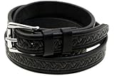 Men 30mm (1 1/8") black bridle leather belt with embossing and double loops. Soft, supple belt that is made from heavy native steer hides and drum dyed for deep, consistent colors. Hot stuffed with just the right amount of "spew" on the grain and flesh sides to have that English feel. Beautiful deep color and smooth, waxy feel. This is a thick, heavy weight belt which is durable, long lasting and will get better with age. This belt has a stainless steel roller buckle and screw posts for easy buckle changing as well as durability. Made in America with pride.- American Made Black Bridle Leather